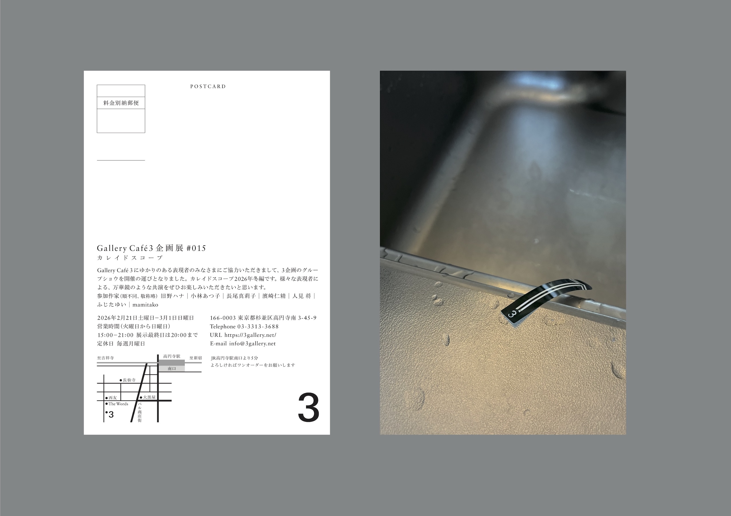今回の展示は、3企画展#015 カレイドスコープの世界にご案内します。Gallery Café 3にゆかりのある表現者のみなさまにご協力いただきまして、3企画のグループショウを開催の運びとなりました。カレイドスコープ2026年 冬編です。様々な表現者による、万華鏡のような共演をぜひお楽しみいただきたいと思います。 今回の展示は、3企画展#015 カレイドスコープの世界にご案内します。Gallery Café 3にゆかりのある表現者のみなさまにご協力いただきまして、3企画のグループショウを開催の運びとなりました。カレイドスコープ2026年 冬編です。様々な表現者による、万華鏡のような共演をぜひお楽しみいただきたいと思います。